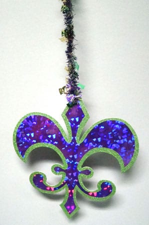 12″ Fleur de lis decoration with tinsel garland hanger.