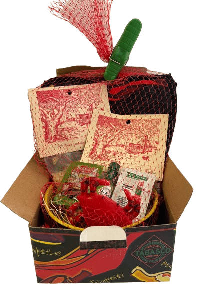 Buy 6 or more for just $8.00 each Red sack filled with Tabasco® hot pads, Tabasco® salsa bowl and jambalaya mix, Red Bean Mix, Tabasco® sauce packet, Tabasco® green sauce mini bottle, Tonys Chachere’s seasoning packet, along with a gator clip to top the sack off.