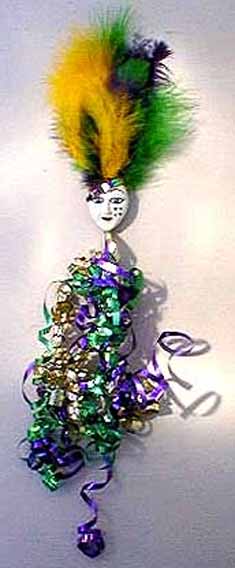 Sequined PGG face decorated with feathers and extra long and thick curling ribbon. Hand crafted by us.
