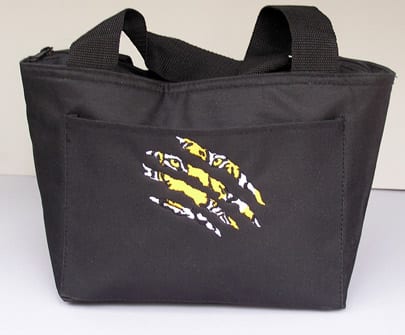 Lunch Tote 600 denier polyester/pvc. zippered main compartment; matching 1.5 wide handles, 7 drop length. color matched handles and zipper. aluminum foil insulated interior. six pack or great lunch cooler. gusseted bottom. This tote is embroidered with the Eye of the tiger “Scratched” design.