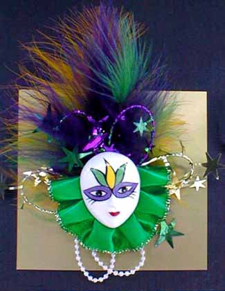 Asst. masked faces with ruffle collar and beads and feathers with star collar head dressing. Hand crafted by us.