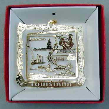 22 kt gold plated brass ornaments, each individually boxed. Mardi Gras top and Louisiana bottom with Comedy Tragedy faces in the corners. Shreveport, Natchitoches, Baton Rouge, Avery Island, and New Orleans are all noted. Jazz Musician with Bourbon Street, Christmas tree, oil rig, alligator, red pepper, and riverboat are all shown.