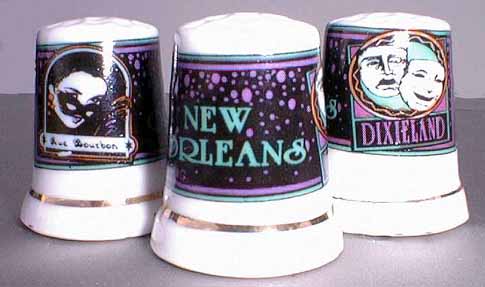 New Orleans Nightlife ceramic goldline thimble features mardi gras theme of masks. Coordinates with mug, bell, shot, keyring, and magnet.