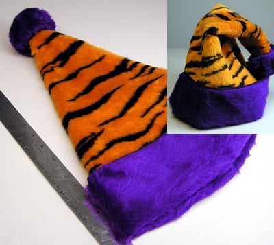 18″ x 12″ tiger plush Santa Hat with purple plush trim. This tiger fabric plush line is made in the USA!