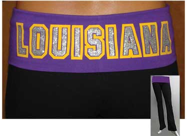 Set 3-2-1-0 Set of 6 including 3-Small, 2-Medium, 1-Large Yoga pants with a purple band around top and “Louisiana” in gold outline and glitter lettering.