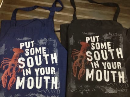 2 navy and 2 black aprons with the very catchy PUT SOME SOUTH IN YOUR MOUTH®¨ crawfish design. If you look closely you’ll see there is an outline of the state in the background