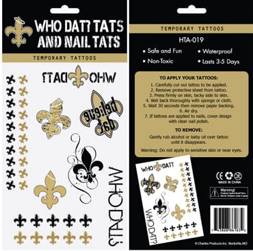 This 4″ x 6″ card has assorted fun tattoos on it. These are non-toxic, waterproof and will last 3-5 days. Directions on the package. Great assortment for all the black and gold fans!! Nail tats added to this assortment, clear fingerpolish will protect them.
